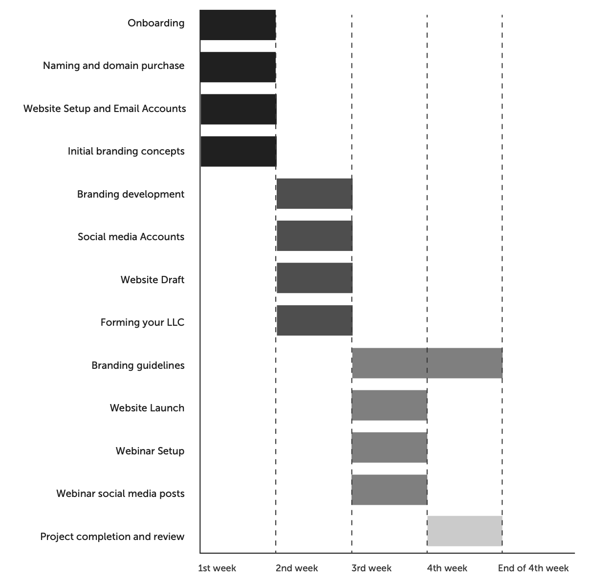 Everything comes together in the final week. We finalize your branding guide, complete the content for your website, and ensure all digital tools are fully integrated and tested. The week concludes with the launch of your website and social media campaigns, ready to impact the market.
